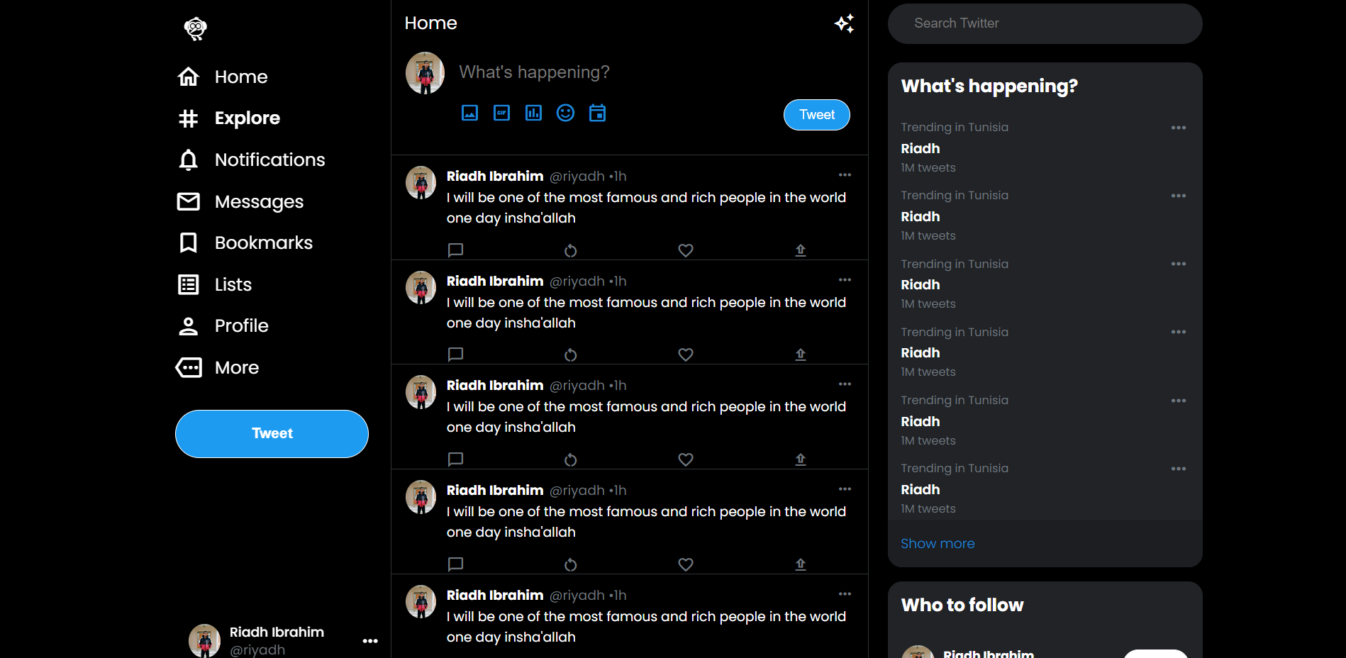 Hi, i'm Riadh Ibrahim; Tunisian 20 years old student and junior web developer. I enjoy learning to get more knowledge about coding and than build the career i dream about in this field.